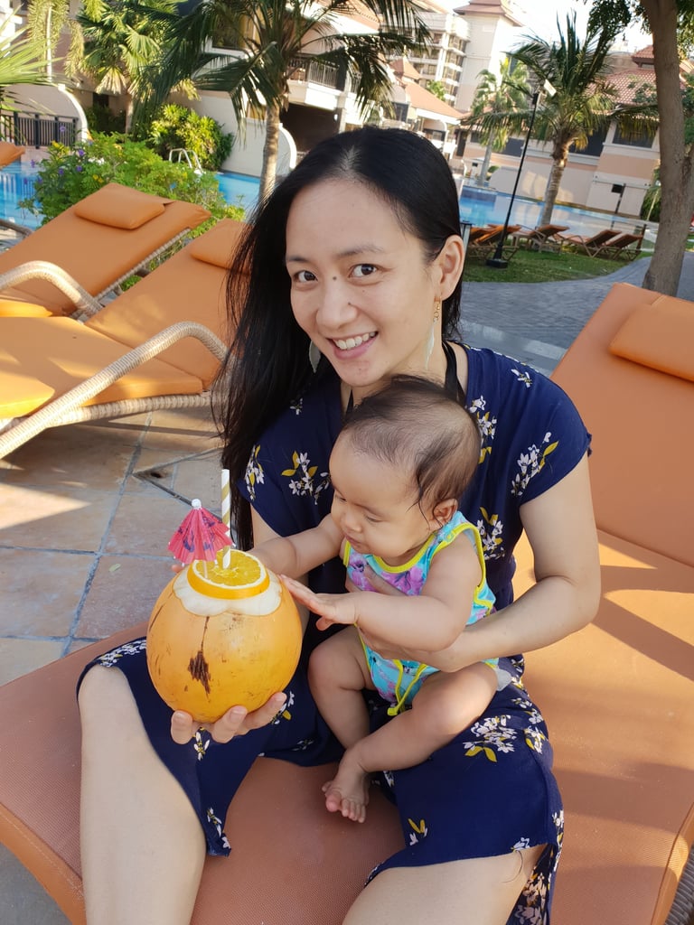 Elyza loved her coconut water. Coconut water can be used as intravenous infusion, so definitely a 7 month old baby can have some. Elyza really enjoyed having sips of the coconut water. A true islander!